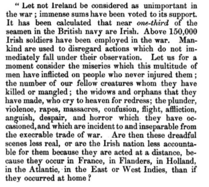 In this context, it is worth it to note that many republicans were deeply opposed to Irish involvement in the British Army, which they viewed as not only traitorous but morally wrong as well. This stands in stark contrast to much of today’s Irish left, which is far less willing to critique that significant Irish involvement in imperial crimes than their forebears of a hundred years ago. Take, for instance, A Letter to the People of Ireland on the Present Situation of The Country (1796). This was a powerful statement by Thomas Russell, one of the founders of the Society of United Irishmen, on Irish involvement in the war against Revolutionary France: