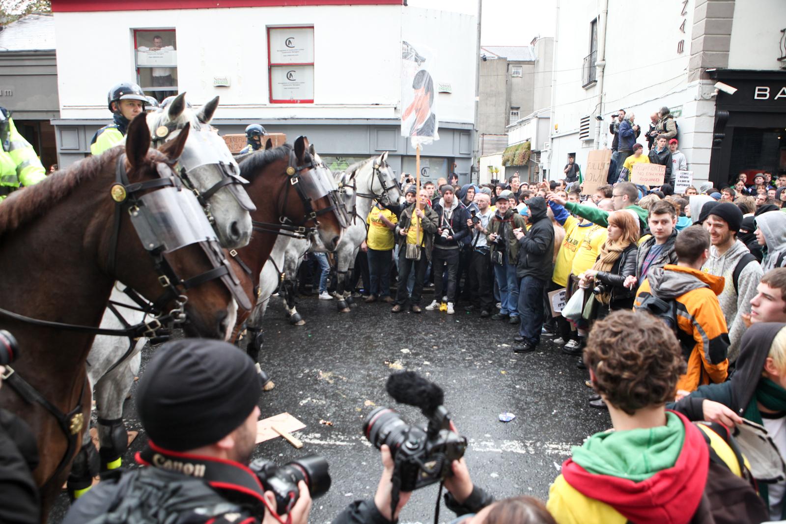 On November 18th 2010, over 2,000 Galway students from NUIG and the Galway-Mayo Institute of Technology (GMIT) participated in a march, which passed without incident[17]. USI claimed victory in the same month by preventing an immediate rise in the student fees to €3,000[18]. On December 9th 2010, 1,500-2,000 students in Belfast protested against their own version of austerity imposed by Westminster which saw the possibility of people being charged up to £9,000 a year for tuition as well as cuts to financial support and were met with police violence[19][20]. The groups involved were QUB FEE, Northern Ireland Public Service Alliance (NIPSA), secondary school-students and an assortment of leftist groups[21]. About 30 students engaged in a sit-down protest and were met with heavy-handed police tactics[22][23]. QUB Students’ Union (QUBSU) condemned the protest[24]. In Derry, 300 took to the streets on the same day[25]. The history of the student movement in the North of Ireland is contingent on that of its counterpart in the United Kingdom due to the continued occupation of the six counties, which will be discussed later.