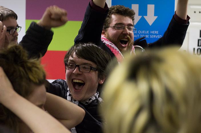 Figure 20: Student activists cheer for the result of the TCDSU BDS referendum on March 22nd 2018[224]