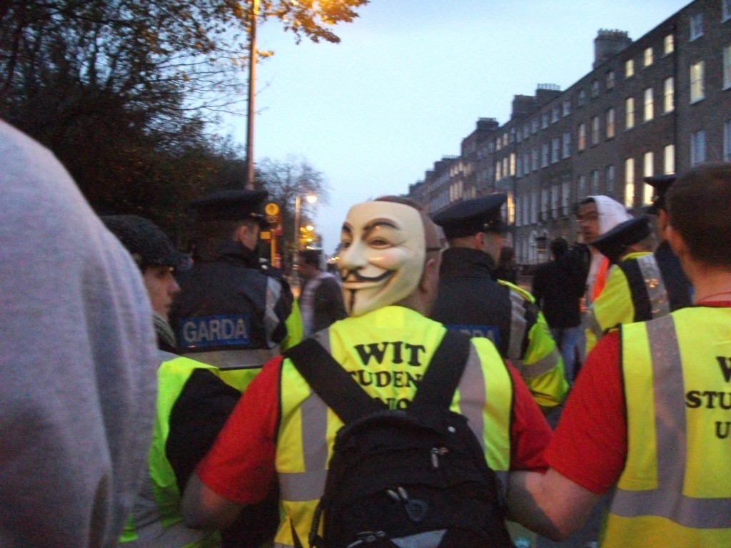 On the same day, in response to the police violence, about 300 students proceeded to engage in a sit-down protest at the Dáil, followed by 30 marching to Pearse Street Garda Station, where it was believed the arrested protestors were held[5]. Another march protesting police violence took place on November 10th 2010, with up to 500 students taking part[6]. This was organised by Free Education for Everyone (FEE) and Students in Solidarity (SIS)[7], with the support of trade unionists and Socialist Workers’ Party (SWP)[8], Éirígí[9], Sinn Féin and the United Left Alliance (ULA). The anarchists such as Workers’ Solidarity Movement (WSM) were active in the student movement too. Out of these groups, it is FEE which was the best known amongst the student body, and which drove the radical student movement. Before the massive ‘Education, Not Emigration’ march of November 3rd 2010 when the USI disavowed student radicals, FEE was active in various campuses organising petitions, direct action and campaigns[10][11].