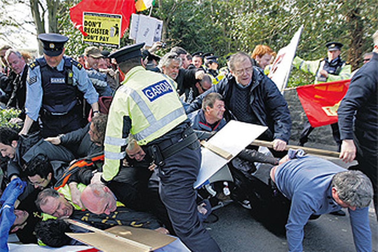 Figure 6: Protestors and Gardaí clash outside of NUIG where the Labour Party conference was being hosted on April 15th 2012[47]