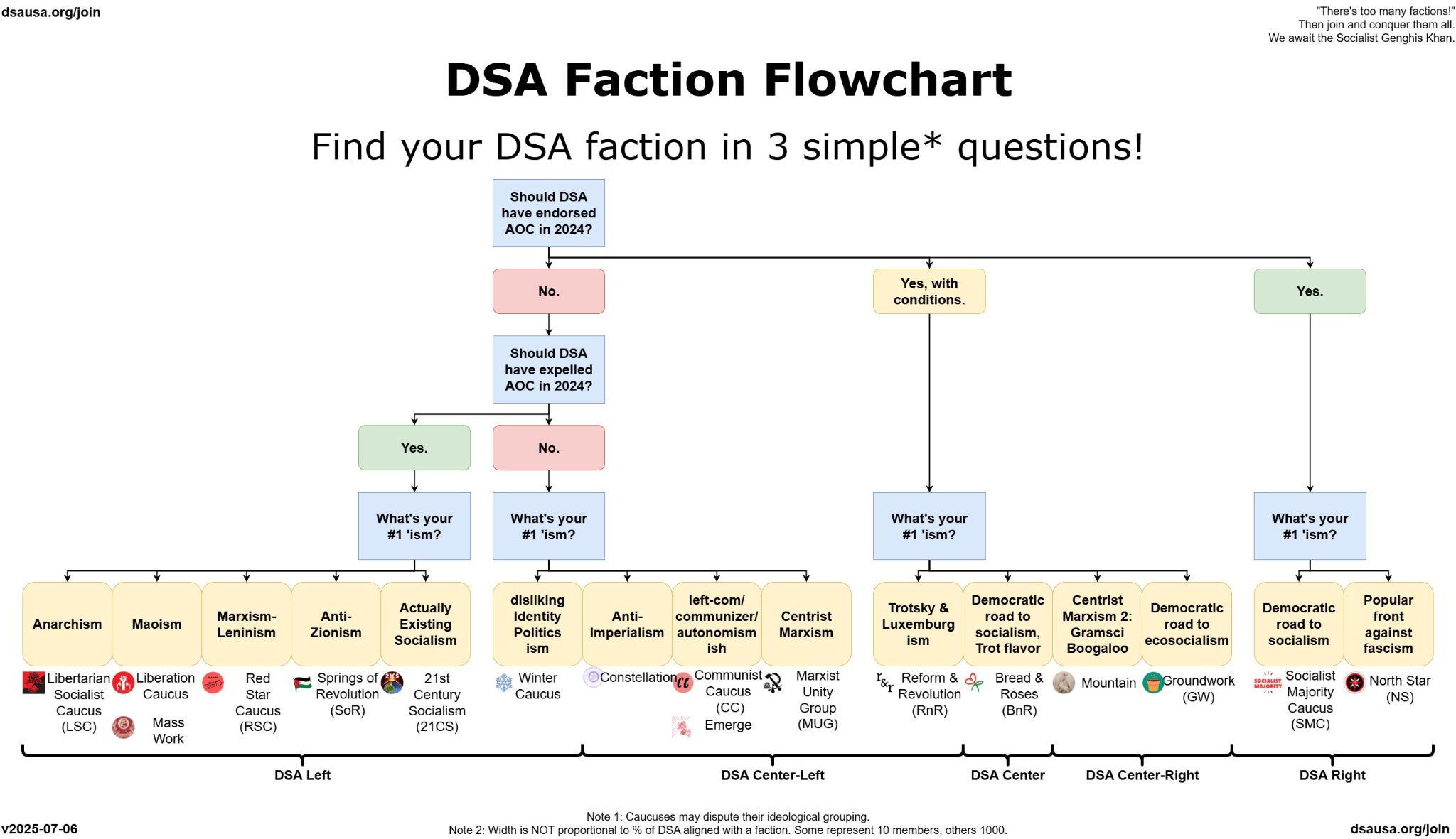 The benefits of this approach is that factions (‘networks’), polemics and pluralism are already integral parts of PBP, therefore, no constitutional changes are required. In addition, PBP is a well-resourced political center, also having electoral presence, being a household name with some working-class following and smouldering traces of radicalism which could be sparked and used as the firetorch with which to freshen leadership, adopt a party programme, and once again, stress the rule of freely-elected workers’ councils on the path to socialist revolution. PBP could be compared to the Democratic Socialists of America (DSA), albeit in its early days, whose organizational structure makes it possible to accommodate a wide range of leftist thought, and indeed does so with 17 factions. This ranges from a ‘DSA Left’ to ‘DSA Center’ and ‘DSA Right’ as indicated below.